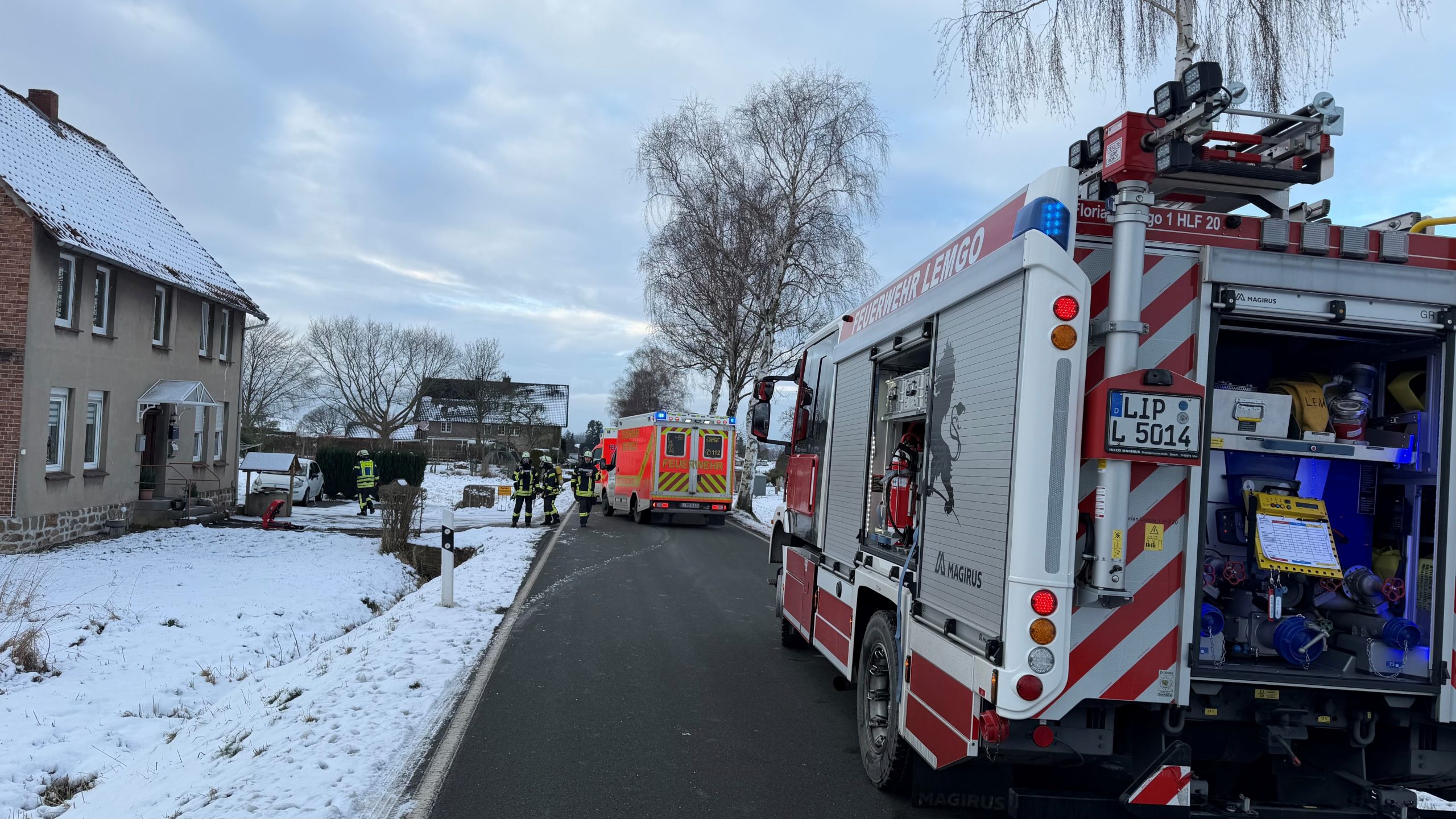 Dies wurde dann auch durch die Besatzung des erst eingetroffenen Fahrzeuges der Feuerwehr bestätigt. So waren letztendlich fünf Fahrzeuge der Feuerwehr und fünf seitens des Rettungsdienstes vor Ort. Lag die Aufgabe des Rettungsdienstes in der sofortigen Behandlung der Personen gingen zwei Trupps der Feuerwehr unter Atemschutz in das Gebäude vor um die scheinbar defekte Heizung des Gebäudes außer Betrieb zu nehmen als auch das gesamte Gebäude Aufgrund der extrem hohen CO-Messwerte zu belüften. Dies zog sich über fast eine Stunde hin, während die vier verletzten Personen in Kliniken abtransportiert wurden. Nachdem keine erhöhten CO-Werte mehr gemessen wurden konnte die Einsatzstelle der Polizei zu weiteren Ermittlungen übergeben werden. Für die Feuerwehr Lemgo war der Einsatz nach gut zwei Stunden abgearbeitet.