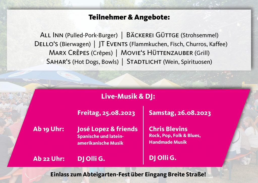 Freitag, den 25.08.2023, und am Samstag, den 26.08.2023, das Abteigarten-Fest in Lemgo.