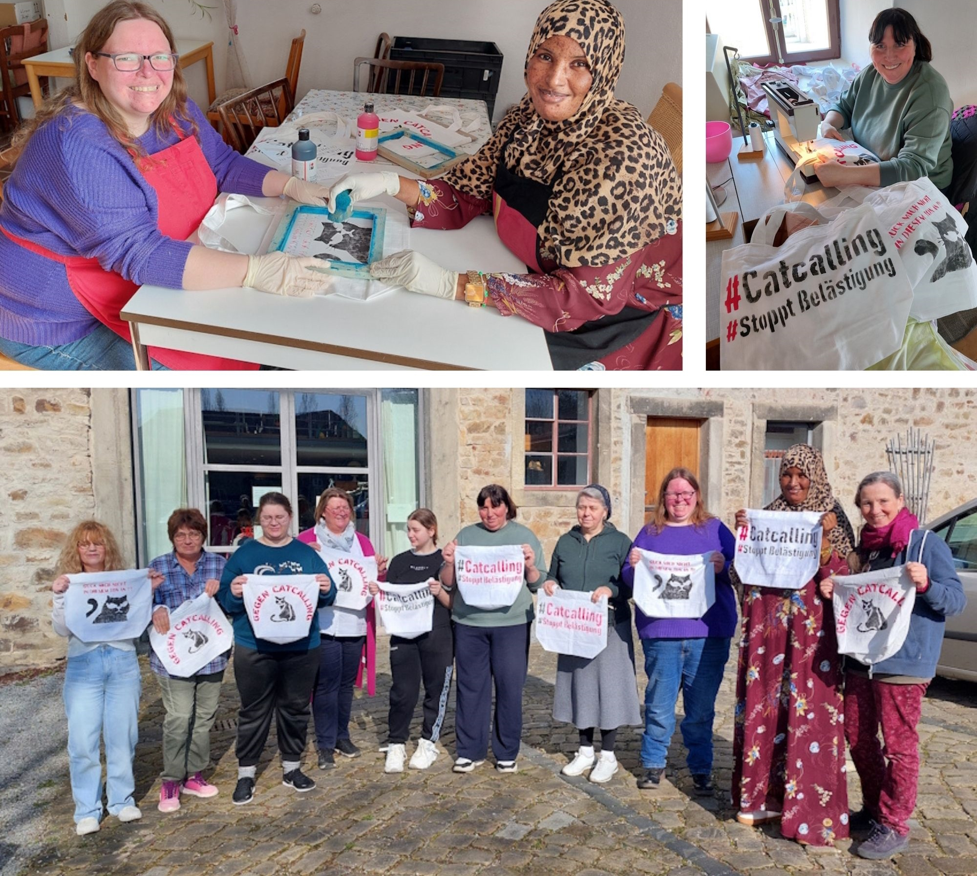 Die Taschen entstanden komplett aus Stoffspenden der Mitarbeitenden des Jobcenters Lippe. Zu bunte oder unpassende Stoffe wurden im Stoff-Fundus der AGH gegen unifarbene Materialien getauscht, um ein einheitliches und wirkungsvolles Design zu ermöglichen. Rund zehn Frauen der AGH haben in den vergangenen Wochen intensiv genäht, die Taschen mit eindrucksvollen Motiven zum Thema „Catcalling“ bedruckt und die Farben abschließend fixiert.