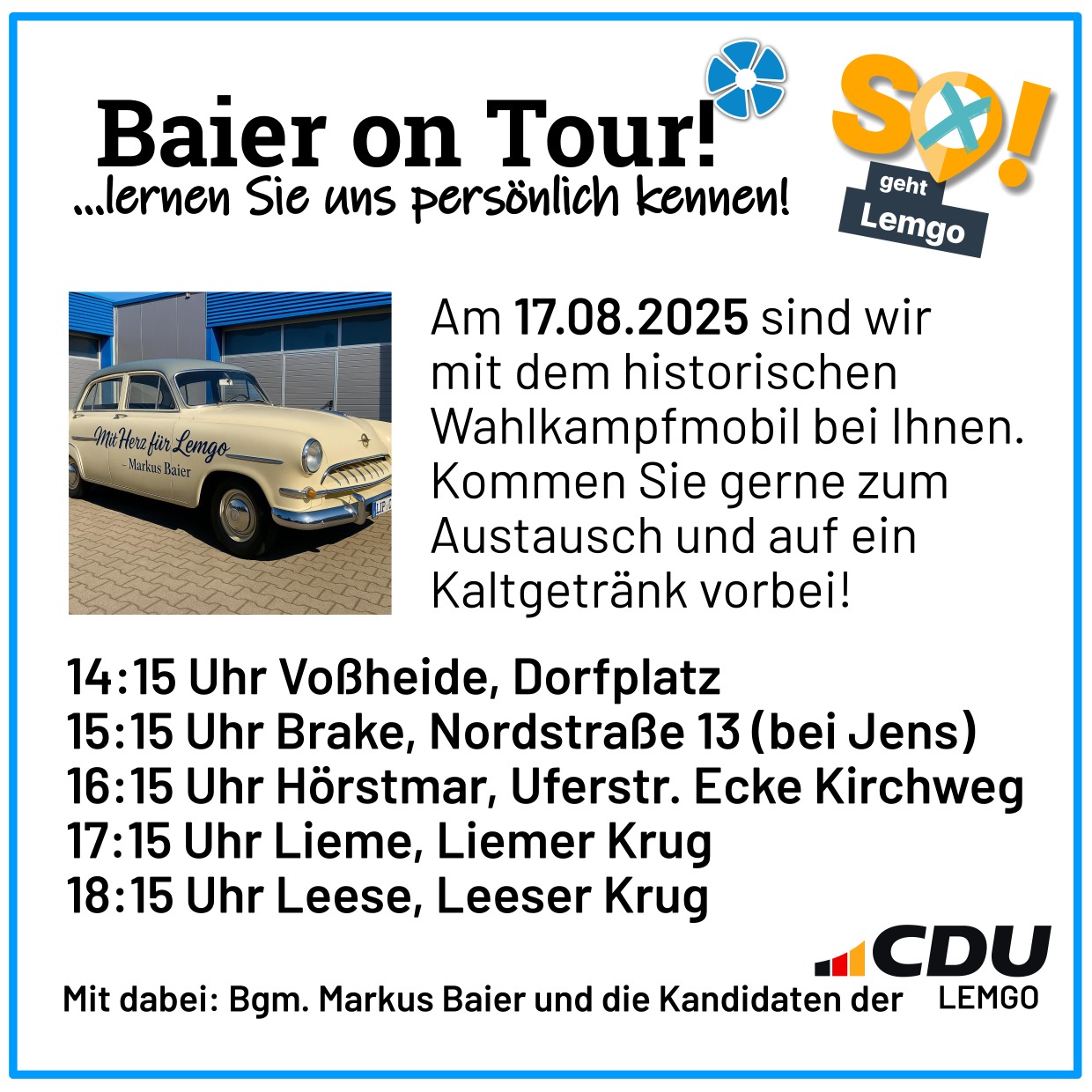 Lemgo. Am Sonntag, den 17. August, startet die CDU Lemgo gemeinsam mit Bürgermeister Markus Baier eine besondere Aktion: Unter dem Titel „Baier on Tour!“ geht es mit einem historischen Fahrzeug quer durch mehrere Lemgoer Ortsteile.