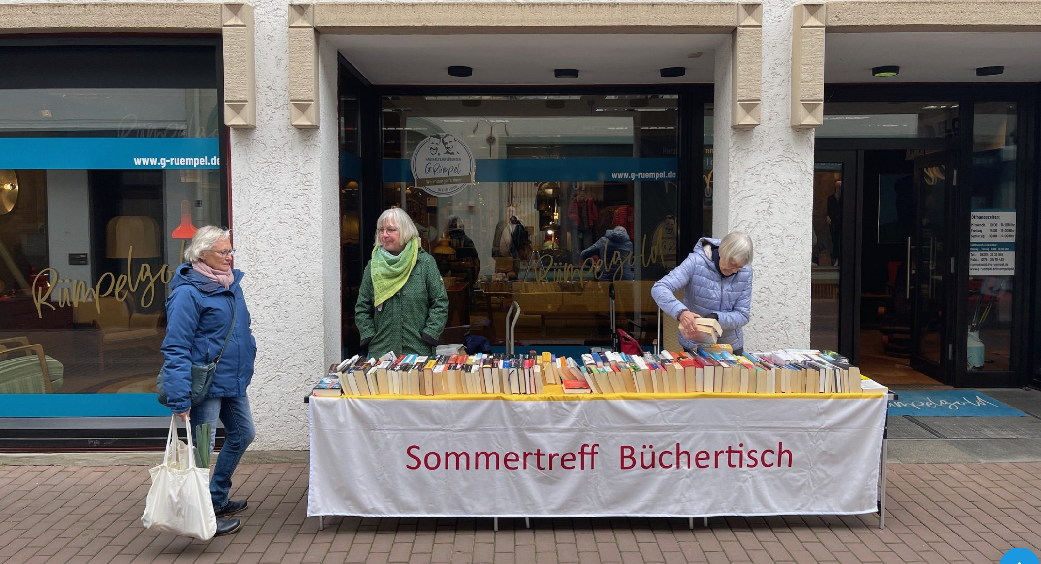 Am Samstag, den 12.10.2024, findet in der Haferstraße 19 (vor G.Rümpel) der traditionelle ‚Büchertisch‘ statt. Liesel Kochsiek-Jakobfeuerborn und Renate Bauer freuen sich zwischen 10 und 12 Uhr auf viele Besucher: die Erlöse kommen dem ‚Sommertreff‘ in Lemgo zugute.
