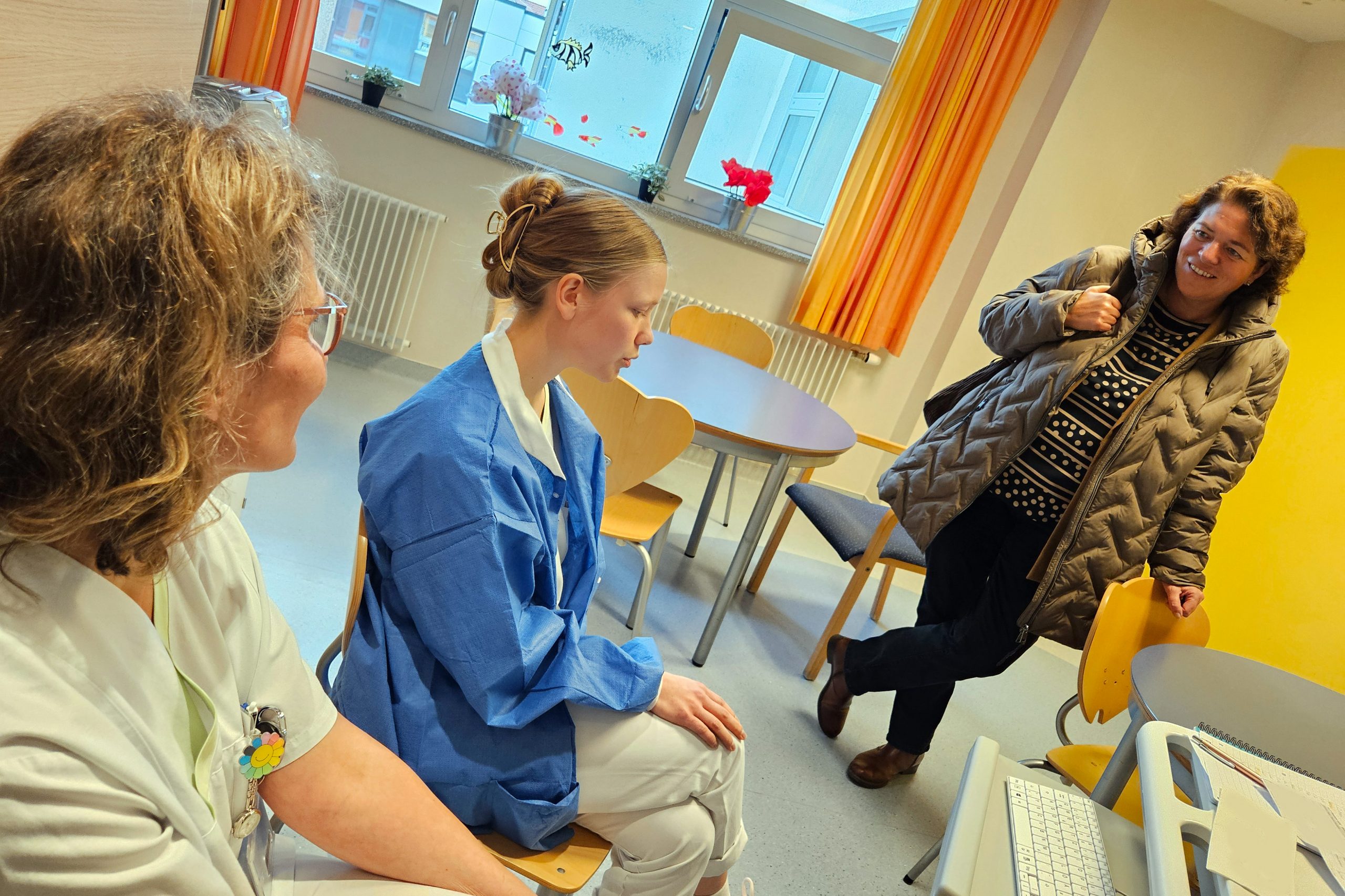 Zum Abschluss ihres Besuchs besuchte Kerstin Vieregge die Kinderklinik. Dort traf sie Ausbildungskoordinator Tim Röwekamp, Praxisanleiterin Dorothea Kessel und eine Auszubildende im dritten Lehrjahr. Die angehende Pflegefachfrau berichtete von ihrem Arbeitsalltag und den aktuellen Herausforderungen. „Ich würde die Ausbildung jederzeit weiterempfehlen. Nach meinem Examen beginne ich mein Berufsleben am Klinikum Lippe“, sagte sie.