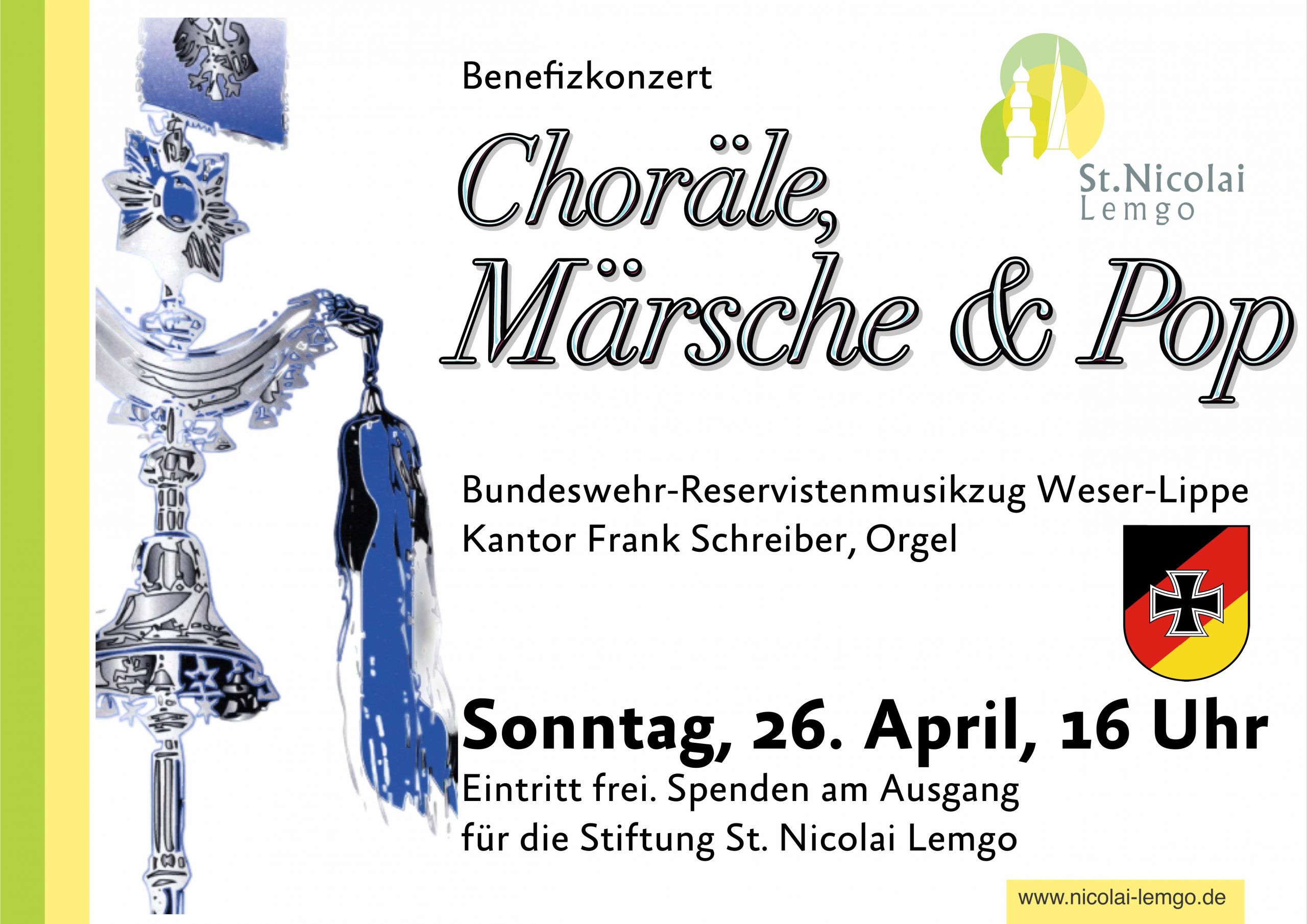 Der Bundeswehr-Reservistenmusikzug Weser-Lippe ist am Sonntag, 19. April in der Lemgoer St. Nicolai-Kirche zu Gast. Um 16 Uhr gibt er ein Konzert mit Chorälen, Märschen und Pop-Musik. Kantor Frank Schreiber wirkt an der Orgel mit. Der Eintritt ist frei. Das Orchester bittet am Ausgang um Spenden zugunsten der Stiftung St. Nicolai Lemgo. Der frühere Lemgoer Bürgermeister Dr. Reiner Austermann hält ein Grußwort.