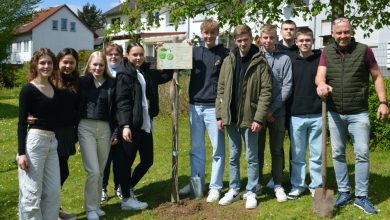 Schüler der Karla-Raveh-Gesamtschule verabschieden sich mit der Pflanzung eines Apfelbaumes auf dem Schulgelände