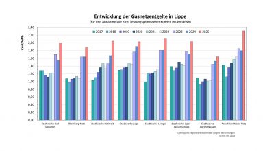 Unternehmen sowie Bürgerinnen und Bürger in Lippe müssen im Jahr 2025 für die Nutzung des Gasnetzes meist deutlich tiefer in…