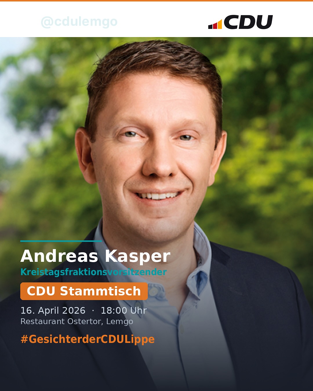 Lemgo, 11. April 2026. Die CDU Lemgo lädt am Donnerstag, den 16. April 2026, um 18:00 Uhr zum CDU-Stammtisch in das Restaurant Ostertor in Lemgo ein. Besonderer Gast des Abends ist Andreas Kasper, der Vorsitzende der CDU-Kreistagsfraktion Lippe.