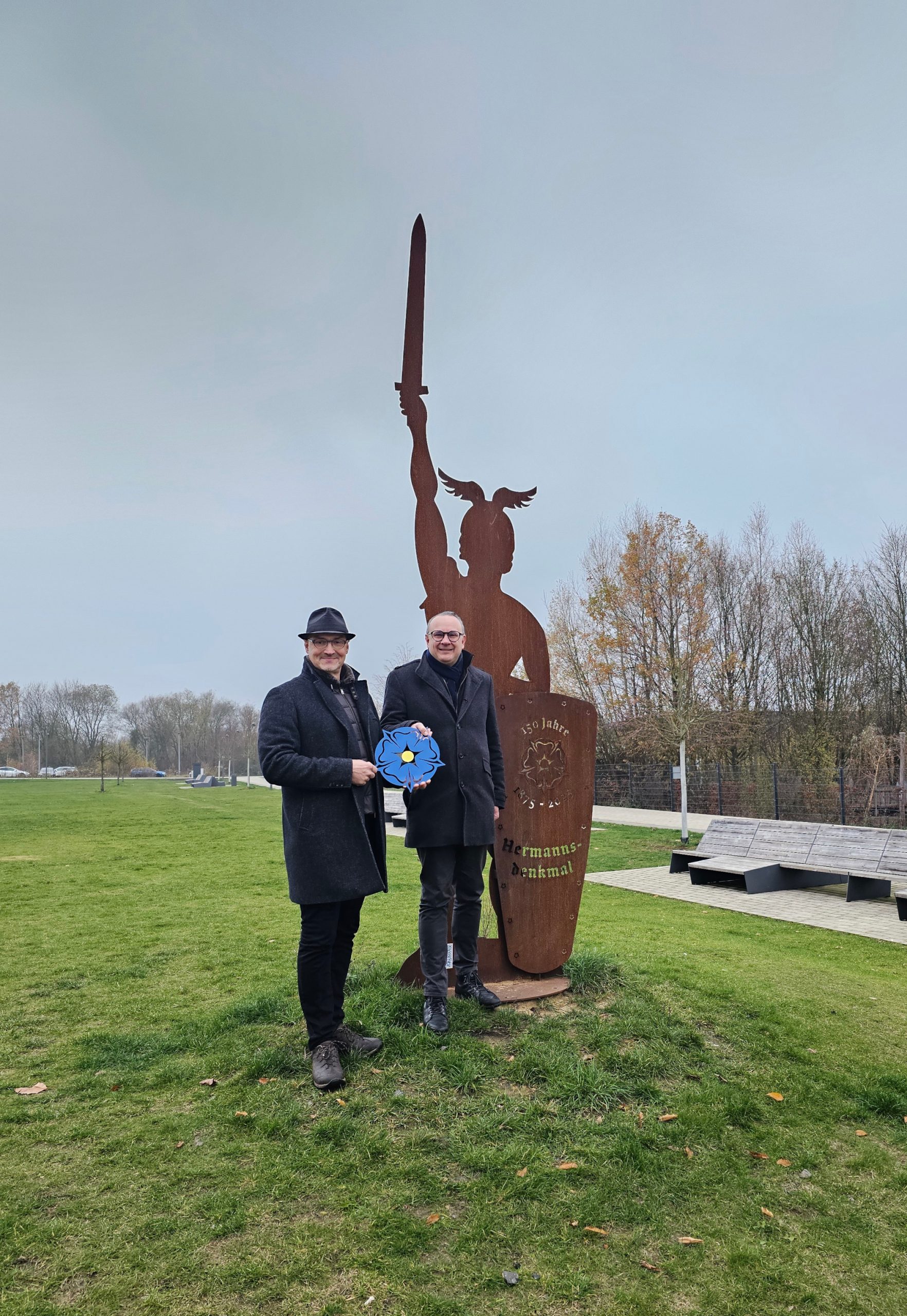 150 Zoll – passend zum 150-jährigen Jubiläum – ragt die Schwertspitze des Hermanns in den Himmel. Sein Standort auf der Campuswiese des Innovation Campus Lemgo hat dem Lemgoer Exemplar den Namen „innovativer Hermann“ eingebracht und 17 Partner sorgen nun gemeinsam dafür, dass die Figur Gäste des Campus, von Forschungsteams bis zu Handballfans, auch zukünftig begrüßt.