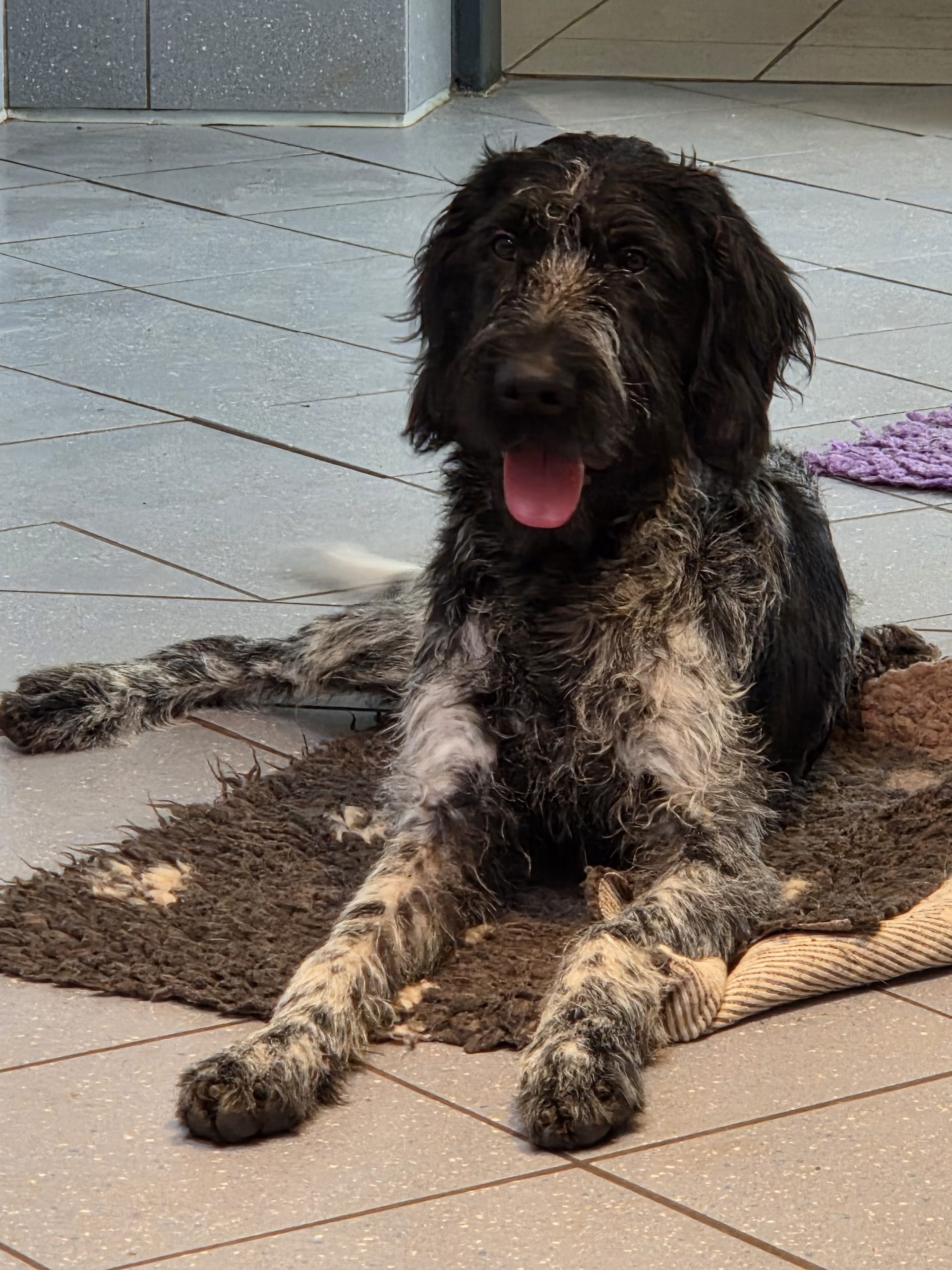 Der junge Rüde gehört zur Rasse der Deutsch Drahthaar Rasse und ist ein Jagdgebrauchshund. Populärer sind die Hunde in der Farbe Braunschimmel, bei Gustav handelt es sich allerdings um einen Schwarzschimmel Rüden.