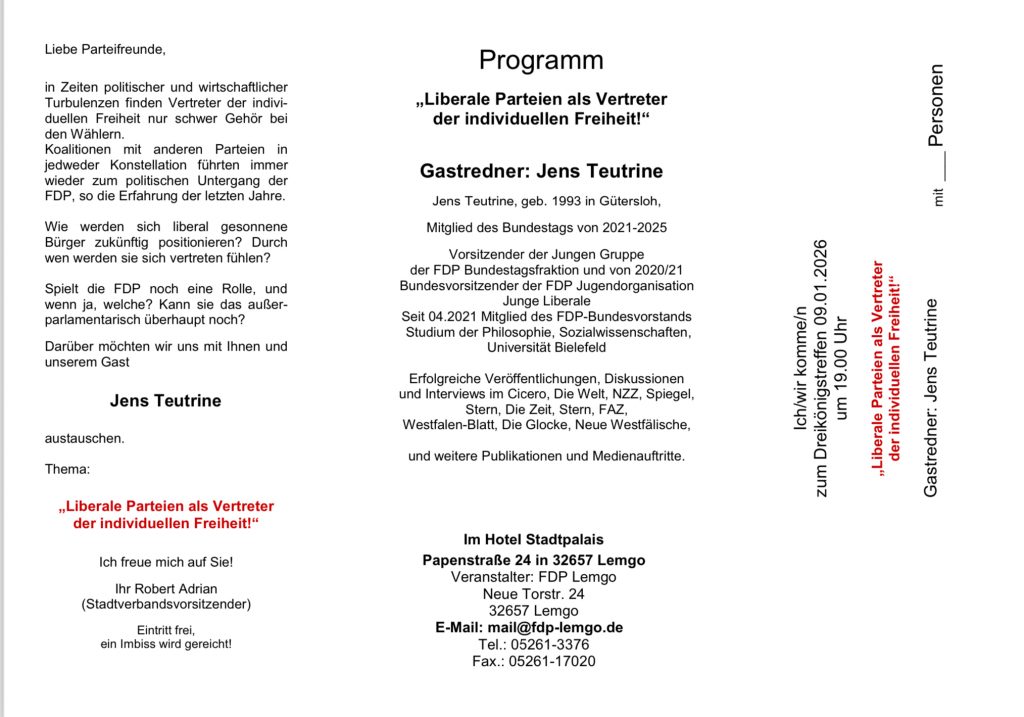 Die FDP Lemgo lädt ein zum 38. traditionellen Dreikönigstreffen am Freitag den 09.01.2026 um 19:00 Uhr im Stadtpalais in Lemgo. Gastredner ist Herr Jens Teutrine zum Thema: