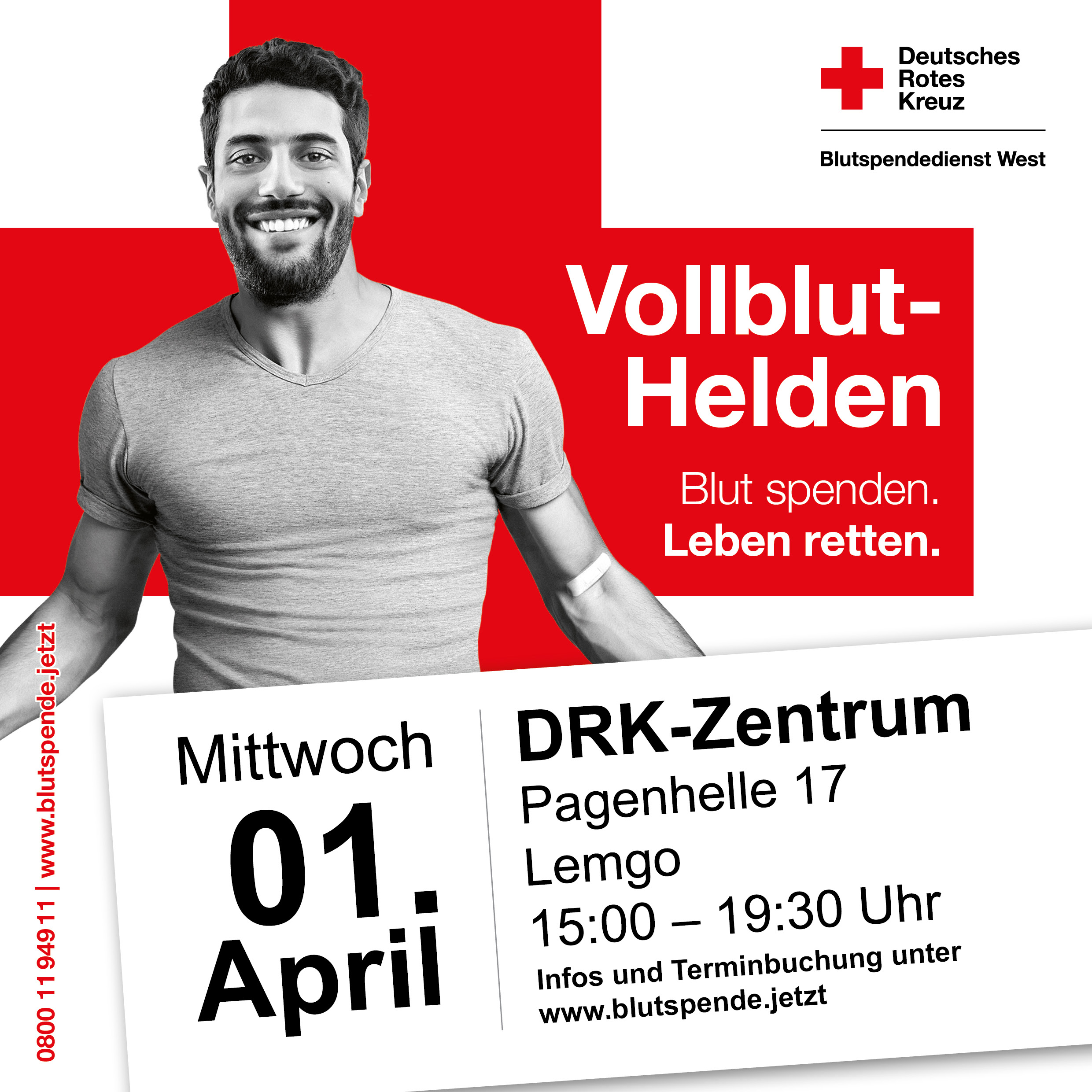 Das Deutsche Rote Kreuz lädt in Lemgo zur Blutspende ein. Gespendet werden kann am 1. April zwischen 15:00 Uhr und 19:30 Uhr im DRK-Zentrum Lemgo, Pagenhelle 17. Das DRK-Team in Lemgo sorgt für beste Verpflegung, die auch vegetarisch oder vegan sein kann.
