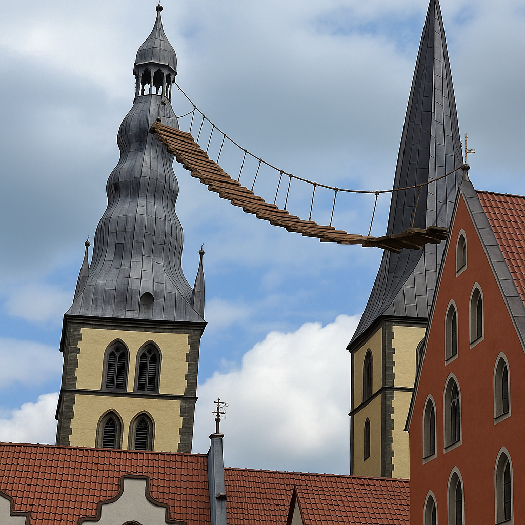 Die Alternative Idee, eine gespannte Hängebrücke zwischen den Türmen St. Nicolai, wurde verworfen nachdem zwei Praktikanten während der Testphase bei starkem Wind fast auf das Dach der Kirche gestürzt waren.