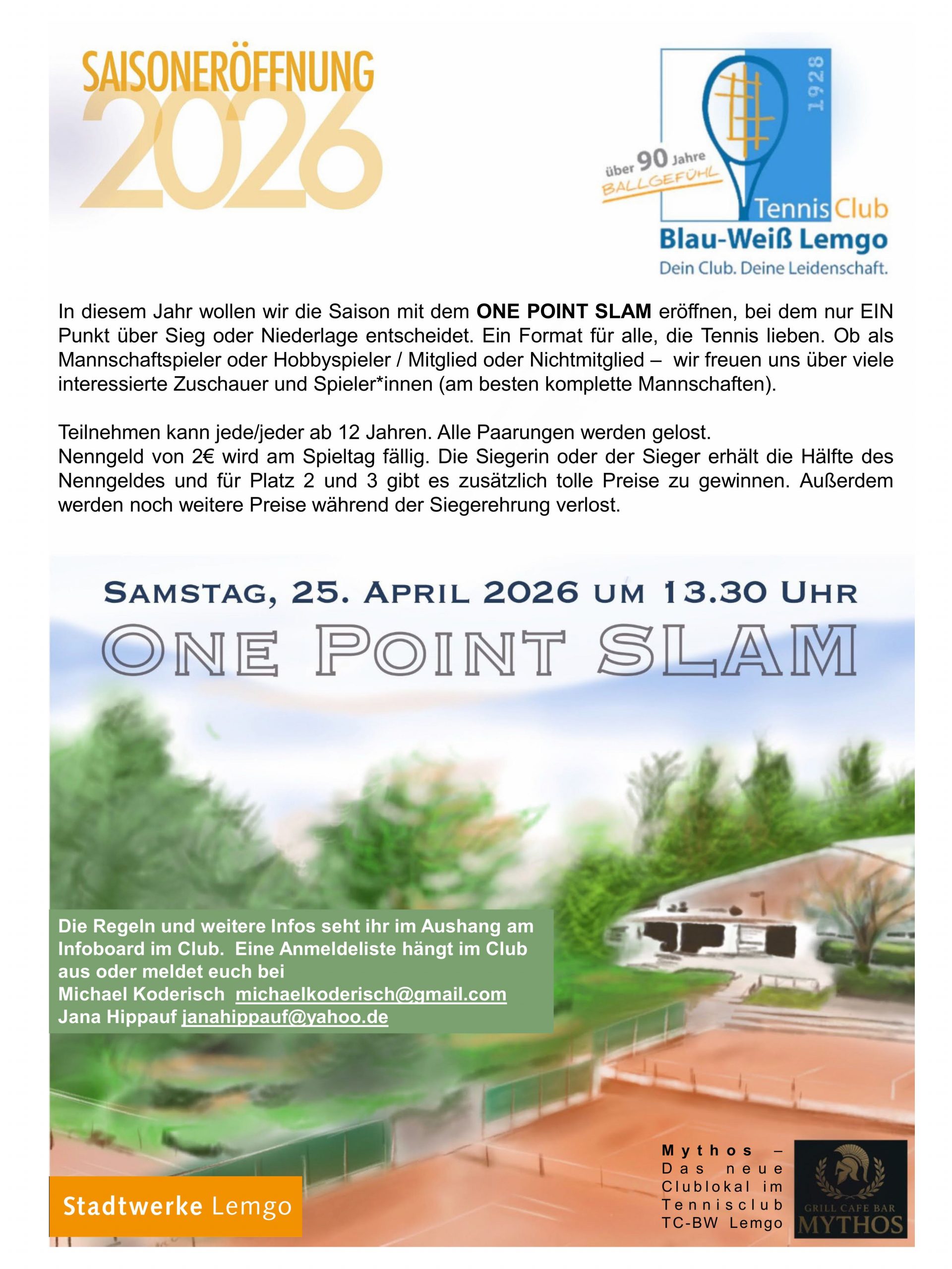 Der Tennis Club Blau-Weiß Lemgo lädt am Samstag, den 25. April 2026, ab 13:30 Uhr zu einer außergewöhnlichen Saisoneröffnung ein. Bei dem sogenannten „One Point Slam“ wird um den Pokal der Stadtwerke Lemgo gespielt – und der Name ist dabei Programm: Ein einziger gespielter Punkt entscheidet über Sieg oder Niederlage.