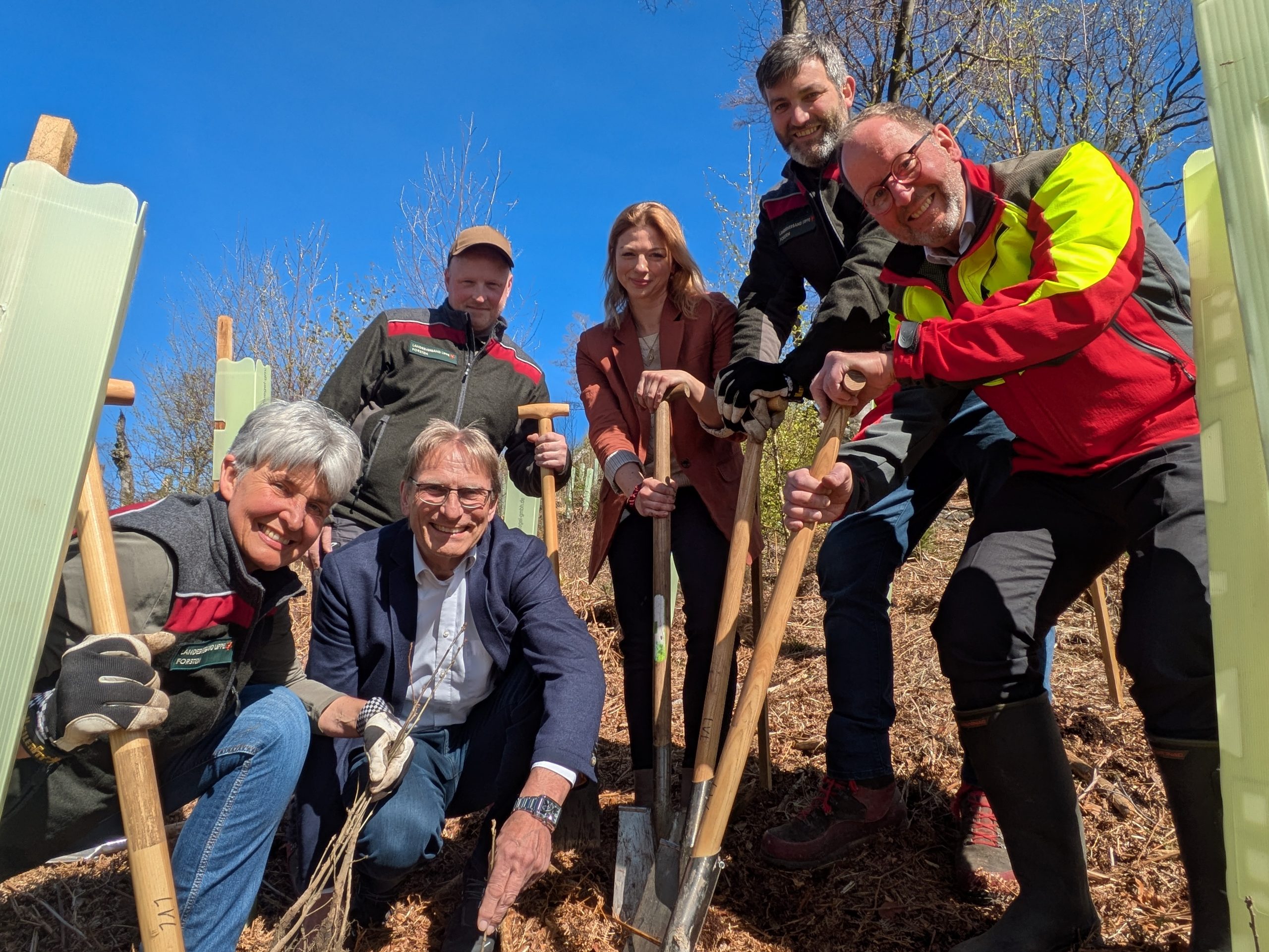 Vertreter der Stadtwerke Detmold, der Stadt Detmold und des Landesverbandes Lippe kamen dazu gestern im Wald in Detmold-Hiddesen zusammen, um bei der Bepflanzung einer Schadfläche selbst kräftig mit anzupacken und mehrere Traubeneichen zu pflanzen. „Die diesjährige Spende nutzen wir, um eine rund 3,5 Hektar große Fläche – das sind ungefähr fünf Fußballfelder – mit Traubeneichen, Edelkastanien, Douglasien und Kiefern wiederzubewalden“, erklärte Susanne Hoffmann, Leiterin der Forstabteilung des Landesverbandes Lippe. Denn um das Risiko flächendeckender Ausfälle – wie mit den Fichtenarealen in Lippe zwischen 2018 und 2022 geschehen – zu minimieren, setzt die Forstabteilung bereits seit den 1980er Jahren auf Mischwälder. „Sie sind resistenter gegenüber den prognostizierten Folgen des Klimawandels.“