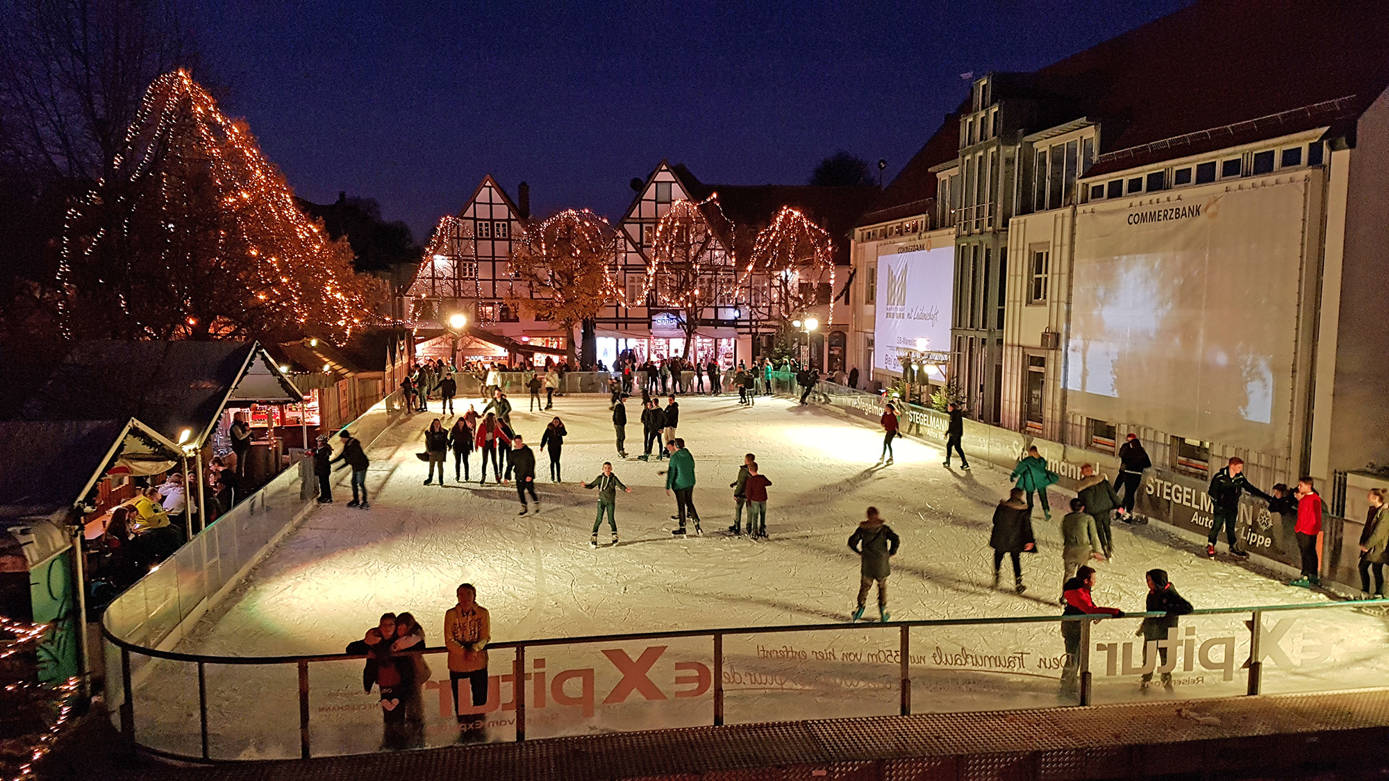 Die „Lemgoer Eiswelt“ war ein großer Publikumsmagnet, der Jung und Alt zur Winterzeit in die Lemgoer Innenstadt zog. Ob zum Schlittschuhfahren, zum beliebten Eisstockschießen oder Glühwein genießen – Die „Lemgoer Eiswelt“ war DER Treffpunkt zur Winterzeit!