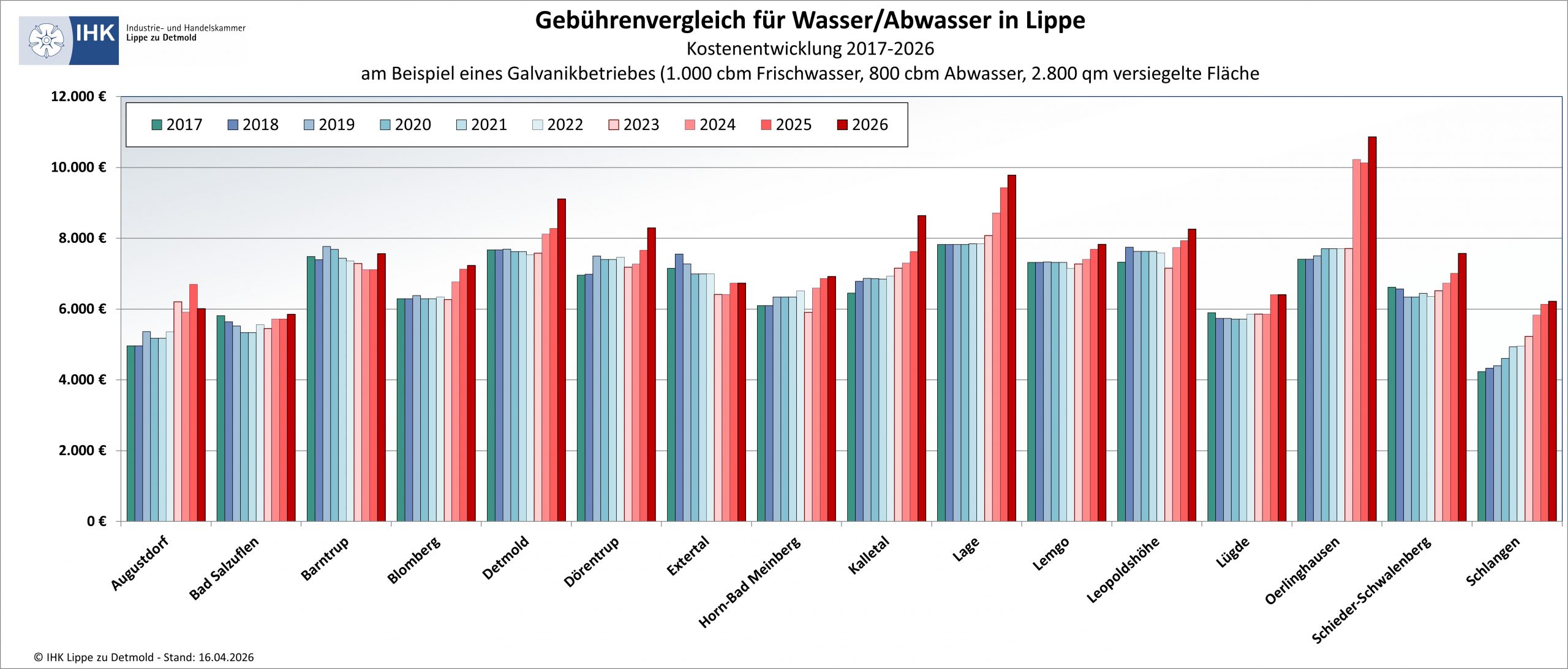 Die individuellen Kosten können Unternehmen jeder Größe sowie Haushalte im Online-Gebührenrechner der IHK Lippeselbst errechnen und mit den Kosten in anderen Kommunen vergleichen. Der Rechner hebt die teuerste und die günstigste Kommune hervor und stellt die Ergebnisse grafisch dar – auch im Vergleich der letzten neun Jahre.