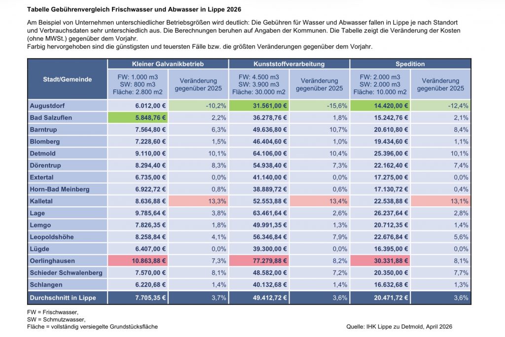 Je nach Umfang der versiegelten Grundstücksfläche, Wasserverbrauch und Abwasseraufkommen müssen Unternehmen in Oerlinghausen besonderstief in die Tasche greifen, gefolgt von Lage und Detmold. Vergleichsweise günstig sind Bad Salzuflen, Augustdorf und Lügde und Schlangen. Für Privathaushalte sind Lage,Oerlinghausen und Lemgo am teuersten,Bad Salzuflen und Schlangen am günstigsten.
