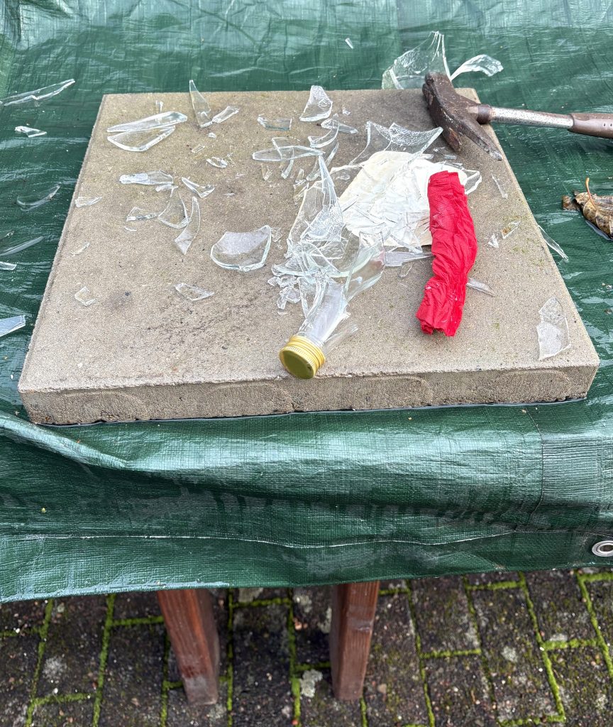 Ausgerechnet der Jüngste machte die Entdeckung: Sören Raabe stieß bei den Arbeiten auf eine alte Wacholderflasche mit Schlehe der Firma Schöttker. Im Inneren: ein altes zusammengerolltes Schriftstück. Doch der Inhalt bleibt vorerst verborgen – denn um an die Dokumente zu gelangen, müsste die Flasche zerschlagen werden.