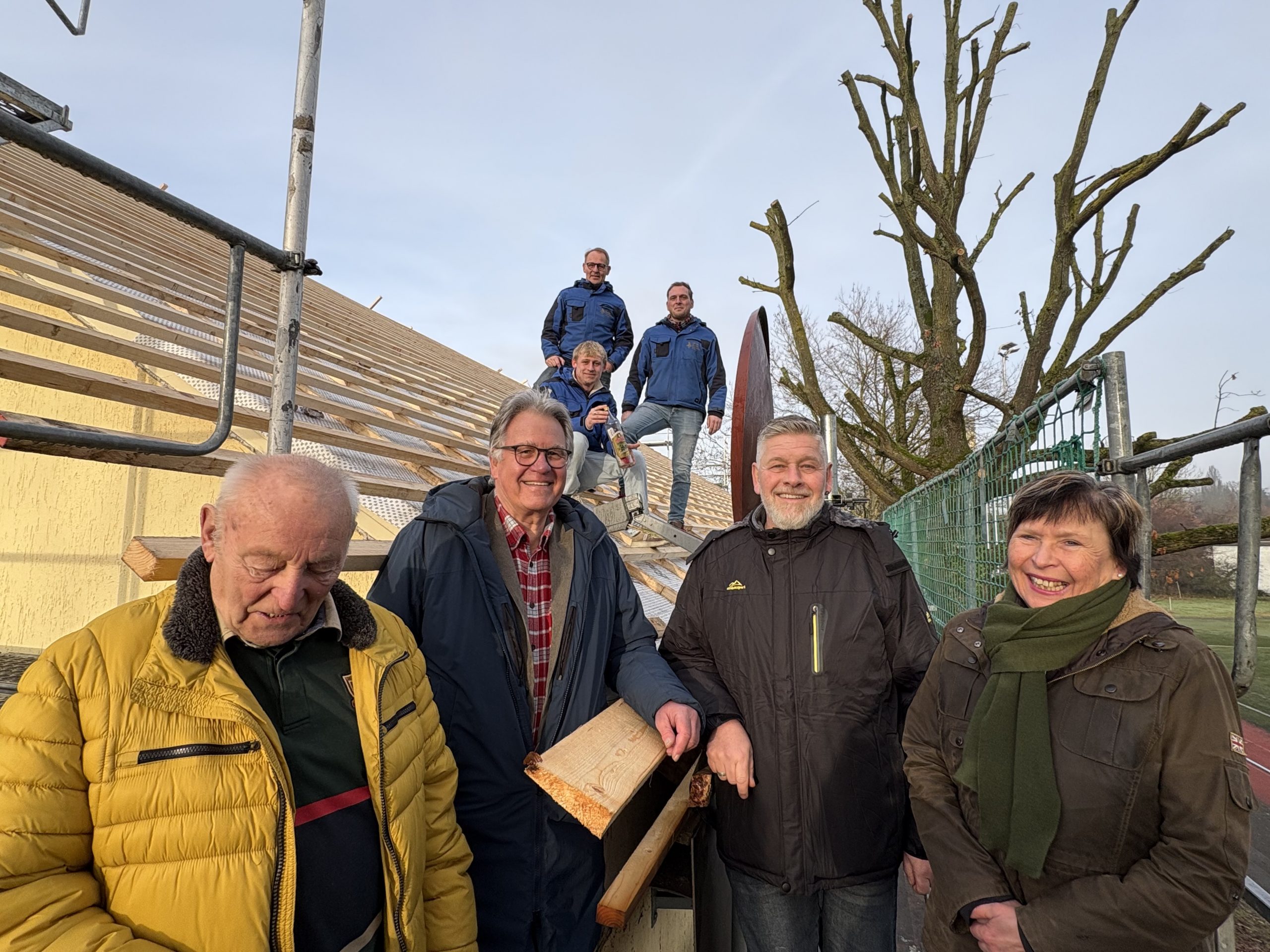 Das Team der Firma Raabe Bedachung begann in dieser Woche damit, das östliche Dach zum Jahnplatz hin abzudecken. Neue Dämmung und frische Dachpfannen sollen folgen. Zur Vorstellung des Funds waren gleich drei Generationen der Familie Raabe mit dabei: Jochen, Stefan und Sören – ein starkes Symbol für Handwerks-tradition über Jahrzehnte hinweg.