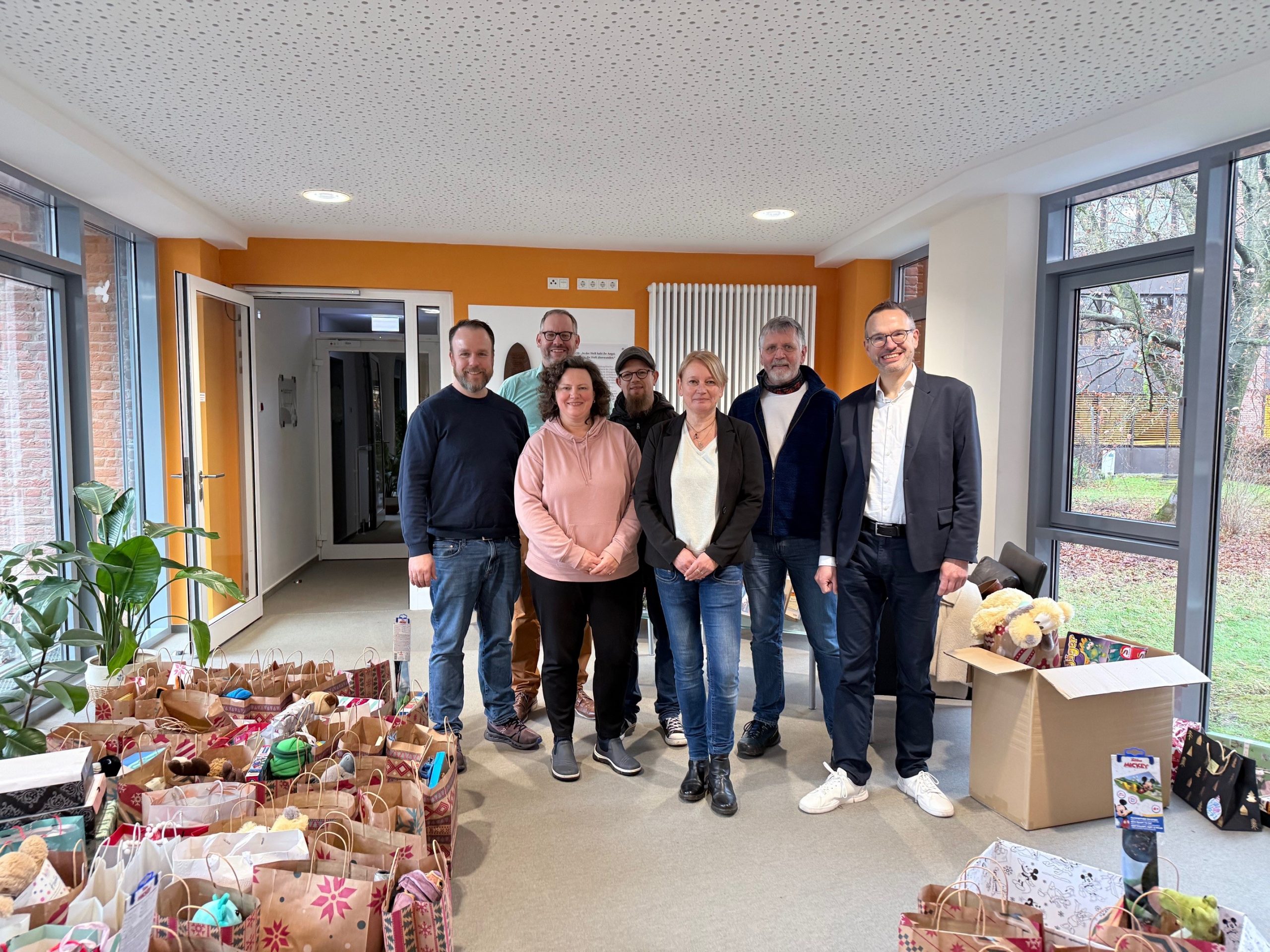 Die großzügigen Spender hatten alle Hände voll zu tun, die Vielzahl der gut gefüllten Tüten und liebevoll verpackten Schuhkartons ins Foyer der Verwaltung zu befördern. Tatkräftige Unterstützung erhielten sie von Geschäftsführer Falko Heise und den Mitarbeitenden der Bereiche Wohnen für Erwachsene und Kinder und Jugendliche. „Wir würden uns freuen, wenn die Geschenke insbesondere den älteren Bewohnerinnen und Bewohnern, die niemanden mehr so richtig haben, zu Gute kommen könnten“, wünschte sich Dr. Florian Hobbeling bei der Übergabe. Noch am selben Tag machten sich die Mitarbeiterin im Geschäftsbereich Wohnen Melinda ThielKrazewski und ihr Kollege Jonathan Rahn auf den Weg und fuhren eine zuvor festgelegte Route ab.