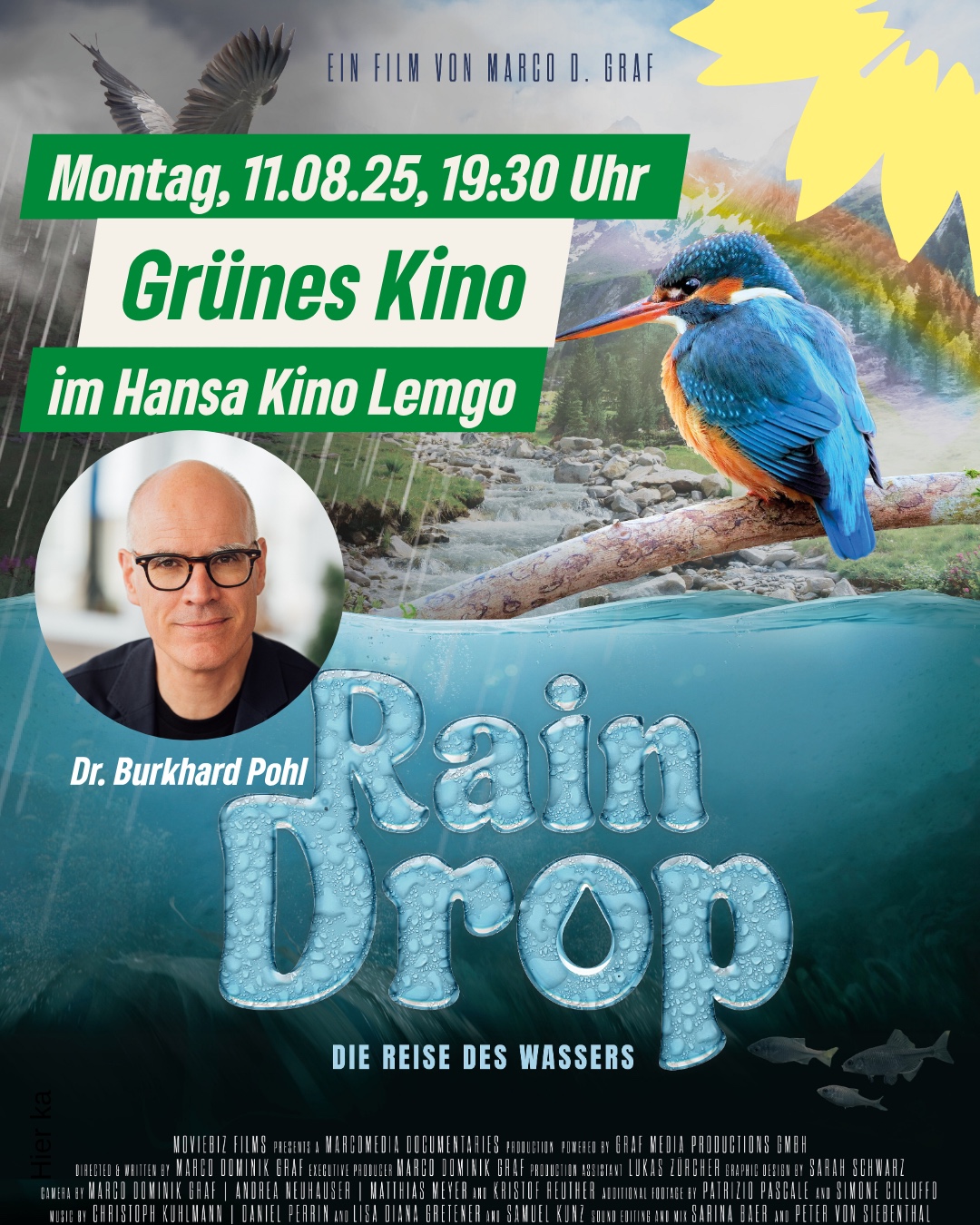 Die Lemgoer Grünen setzen ihre Filmreihe im Hansa-Kino fort. Am Montag 11. August um 19.30 Uhr geht es mit dem Film „Raindrop – Die Reise des Wassers“ (2025) um das kostbarste Element unseres Planeten: Wasser. Vor dem Hintergrund der weltweiten Wasserknappheit, die wir auch hierzulande spüren, gewinnt der vielfach ausgezeichnete Dokumentarfilm neue Aktualität. Nach dem Film besteht Gelegenheit zur Diskussion mit Bürgermeisterkandidat Dr. Burkhard Pohl und Landratskandidatin Dr. Inga Loke.