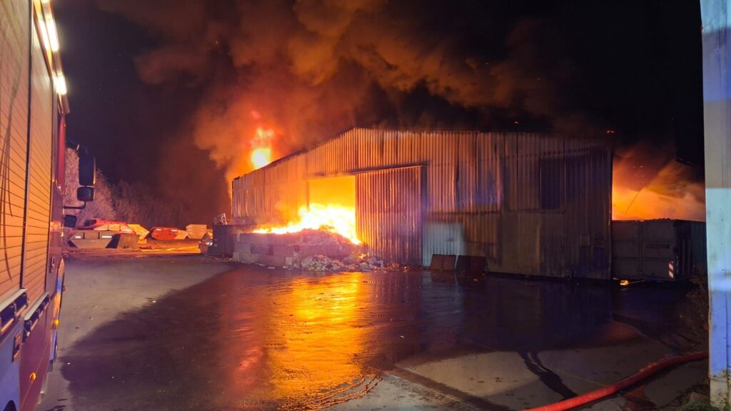Schon auf Anfahrt zur Einsatzstelle war ein deutlicher Feuerschein sowie eine starke Rauchentwicklung sichtbar, weshalb das Einsatzstichwort frühzeitig von Feu 3 auf Feu 4 – „Großbrand“ erhöht wurde. Das Feuer war im gegenüberliegenden Teil einer Wertstoff-Sortierhalle ausgebrochen – in jener Anlage, in der es bereits Anfang Mai zu einem größeren Brand gekommen war. In der Halle werden hauptsächlich Verpackungsabfälle aus den gelben Wertstofftonnen gelagert.