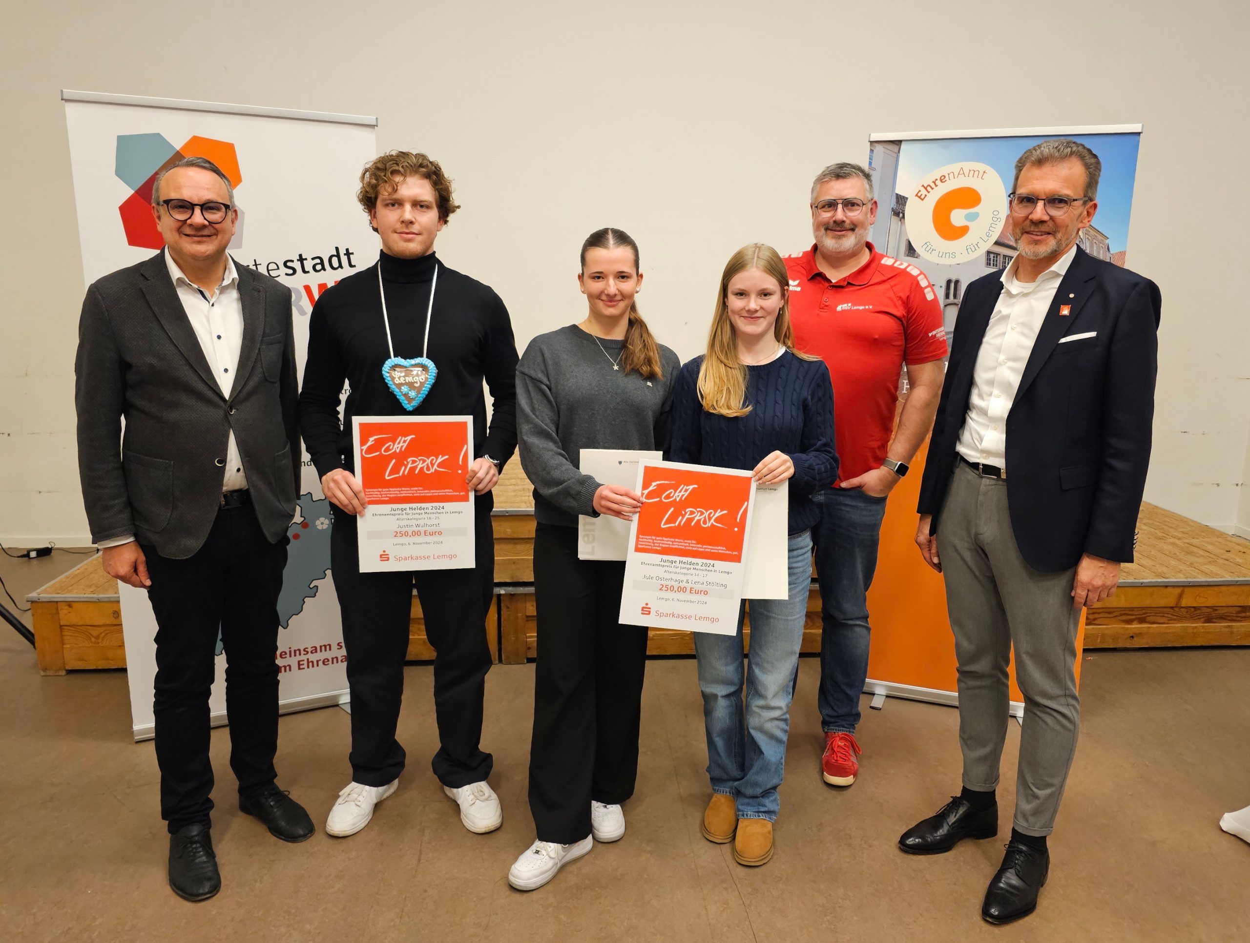 Sie sind Heldinnen und Helden des Ehrenamts und als solche nun ausgezeichnet worden: Erstmals wurde in Lemgo ein Preis für das ehrenamtliche Engagement junger Menschen verliehen. Gleich drei junge Menschen konnten die Glückwünsche und das Preisgeld entgegennehmen, die Bürgermeister Markus Baier und Sparkassen-Vorstandsvorsitzender Klaus Drücker im Gepäck hatten: Jule Osterhagen, Lena Stölting und Justin Wulhorst waren die Preisträgerinnen und der Preisträger des Abends.