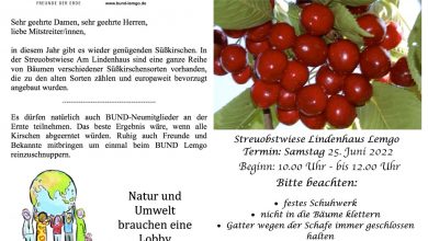 Herr Hennebrüder vom BUND Lemgo teilt uns folgendes mit: „Da wir in diesem Jahr genügend Süßkirschen haben und wir möchten,…