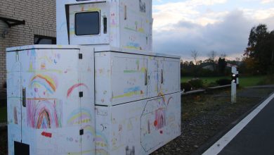 Mehrere Regenbögen, farbige Häuschen oder Wiesen mit Bäumen und Blumen: Der mobile Blitzeranhänger „Hermann“ des Kreises Lippe hat sein tristes…