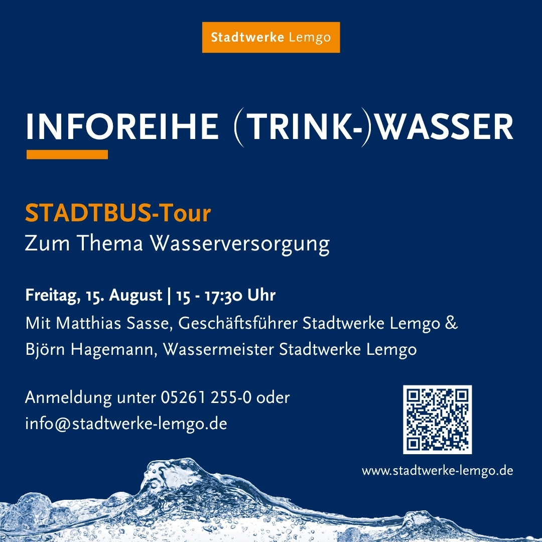 Lemgo – Woher kommt eigentlich das Lemgoer Trinkwasser – und wie bleibt es so zuverlässig sauber und frisch? Am Freitag, 15. August 2025, laden die Stadtwerke Lemgo alle Interessierten zu einer besonderen STADTBUS-Tour ein. Von 15:00 bis ca. 17:30 Uhr geht es gemeinsam mit Geschäftsführer Matthias Sasse sowie Björn Hagemann (Netzbetrieb Gas, Wasser & Wärme) zu verschiedenen Hochbehältern, Brunnen und Wasserwerken. Die Teilnehmenden erhalten spannende Einblicke in die Investitionen der Stadtwerke, die für den Erhalt der hohen Trinkwasserqualität sorgen. Treffpunkt ist um 15:00 Uhr an der Haltestelle Stadtwerke, am Bruchweg.