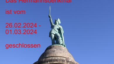 Detmold, 19. Februar 2024. Aufgrund von Baumaßnahmen kann das Hermannsdenkmal in der Zeit vom 26. Februar bis voraussichtlich 1. März 2024 nicht geöffnet bzw. bestiegen…