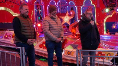 Bei kalten Temperaturen und unter einem abendroten Himmel haben Bürgermeister Markus Baier und die Schausteller Antonio Noack und Siegbert Friedt…