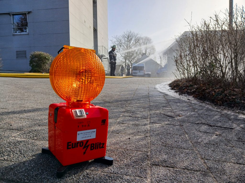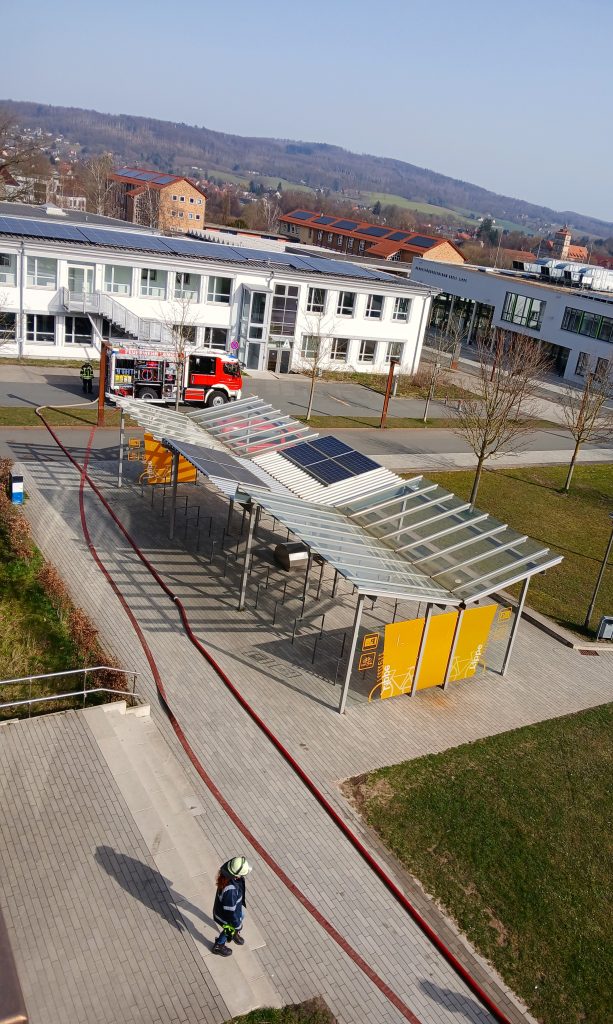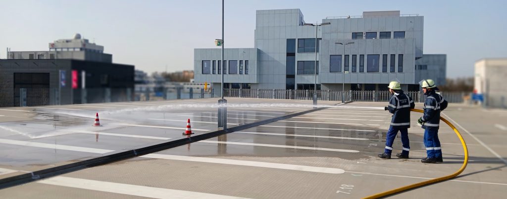 Nach der Pause ging es weiter zum Parkhaus am Campus der TH OWL. Hier lautete das Szenario: Ein Fahrzeugbrand auf dem Oberdeck mit einer verletzten Person. Die neu eingeteilten Trupps übernahmen ihre Aufgaben. Die Wasserversorgung musste zunächst über einen Unterflurhydranten aufgebaut und anschließend zur Steigleitung geführt werden. Da es Schwierigkeiten mit dem Wasserentnahmekasten auf dem Oberdeck gab, entschied sich der Gruppenführer für eine alternative Lösung: Eine Schlauchleitung wurde außen am Gebäude nach oben verlegt.