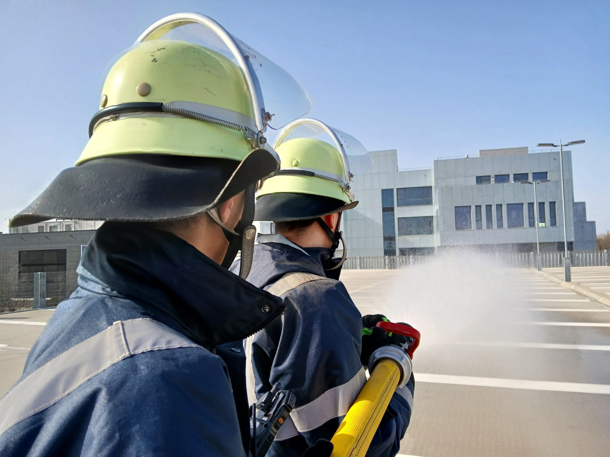 Schließlich konnten zwei C-Rohre auf den angenommenen Fahrzeugbrand gerichtet werden. Die verletzte Person wurde erst versorgt und mit der Trage über die Abfahrten des Parkhauses nach unten transportiert. Noch vor Ort reflektierten die Teilnehmenden den Ablauf der Übung. Anschließend wurden alle Geräte wieder verladen und zur Wache zurückgebracht. Dort halfen alle gemeinsam mit, das LF 10 wieder vollständig einsatzbereit zu machen und die verwendeten Schläuche zur Reinigung vorzubereiten.