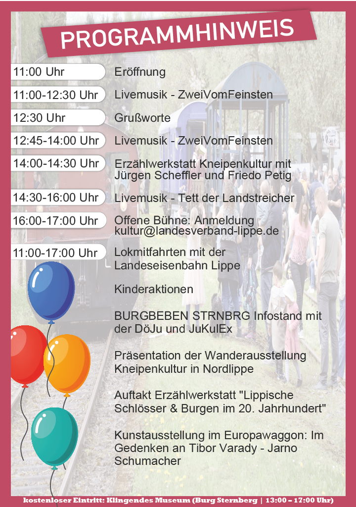 Zudem wird auf 15 Bannern die Wanderausstellung „Kneipenkultur in Nordlippe” präsentiert. Um 14:00 Uhr geben Jürgen Scheffler und Friedo Petig vertiefende Einblicke in dieses Stück Heimatgeschichte. Gleichzeitig fällt der Startschuss für das neue Erzählwerkstatt-Projekt „Leben, Arbeiten und Feiern – Lippische Schlösser und Burgen im 20. Jahrhundert“.