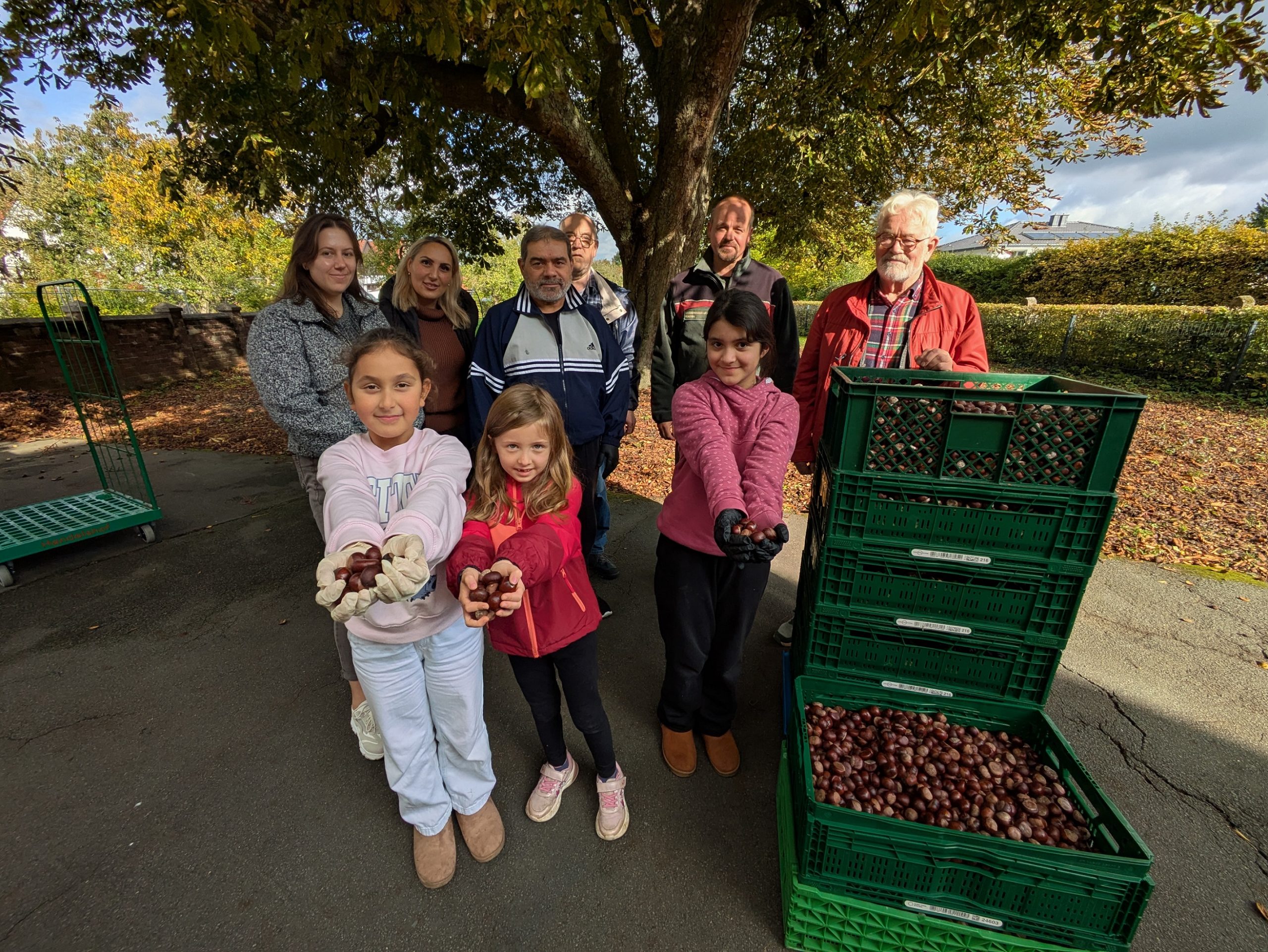 Horn-Bad Meinberg, 14. Oktober 2025. Die werden dem Damwild garantiert schmecken: Die Kastanien aus der Horner Innenstadt, die von einem prächtigen Kastanienbaum stammen. Gesammelt haben sie Kinder und Erwachsene der Geschäftsstellen der Lebensmittelausgabestelle Horn und des Kinderschutzbundes in Horn.