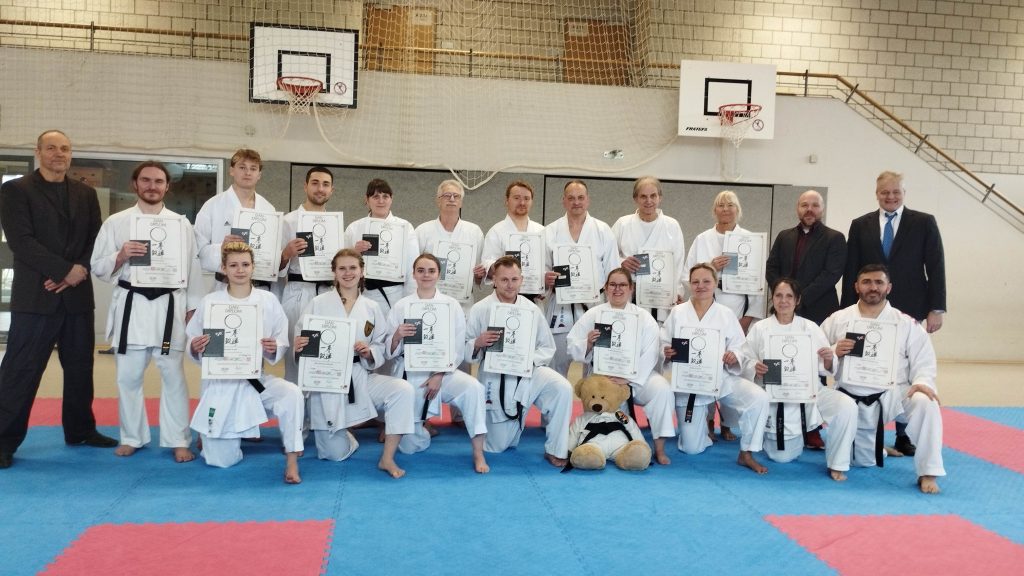 alle erfolgreichen Karateka mit neuem Dangrad und ihre Prüfer: Leandra Vogel, Jule Albrecht, Carolin Drüke, Thorben Ullrich, Saskia Rossol, Violetta Fraczek, Margot Ortmann und Maksim Harutyunyan (v.v.l.), Wolfgang Henkel, Sebastian Heun, Tim Braun, Jonathan Henkel, Bianca Stöcker, Norbert Nelde, Sebastian Heun, Daniel Sobanski, Dirk Preuß, D. Jürgen Schulz, Ulrike Fleer, Dennis Dreimann und Stefan Krause (h.v.l.).