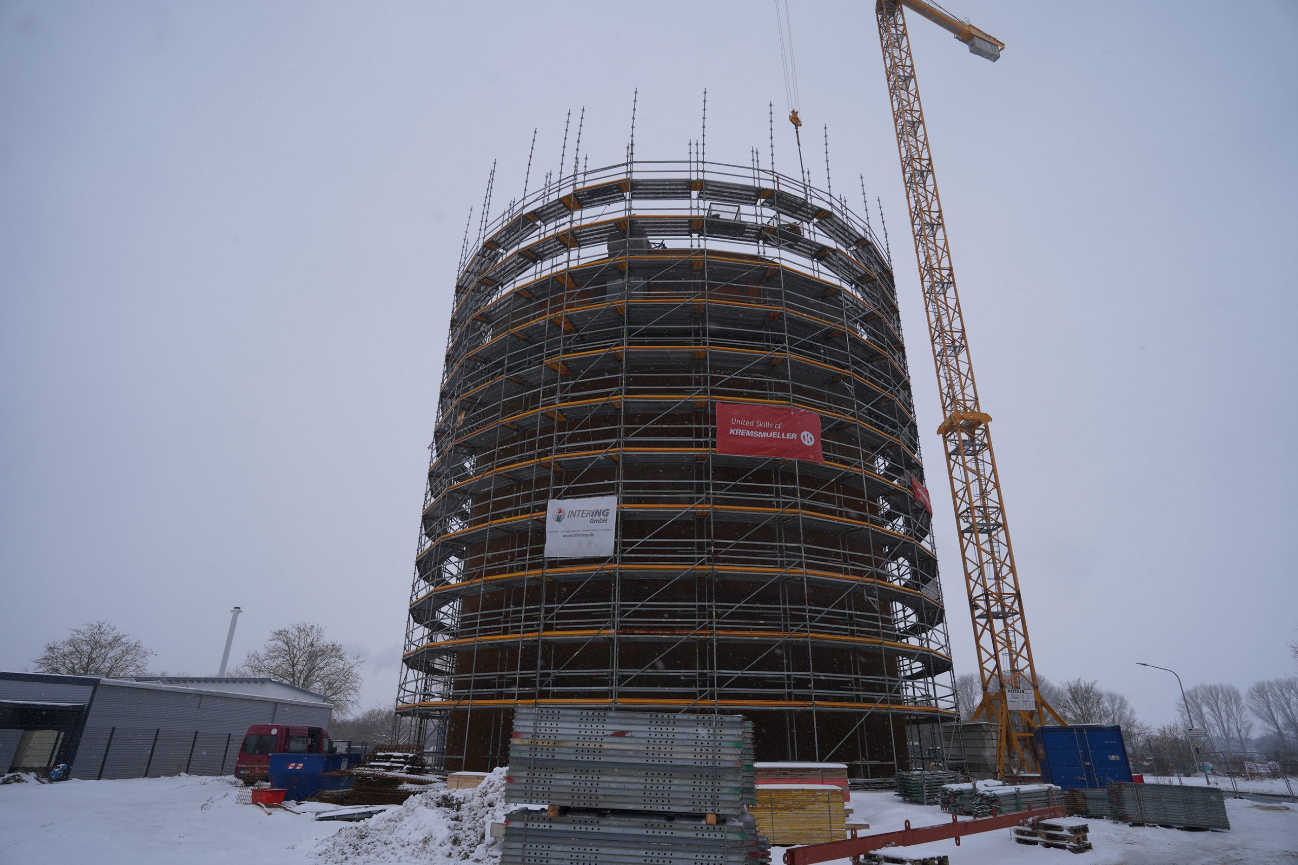 Der rund 50 Meter hohe Großwärmespeicher entsteht am Liemer Weg. Er wird zukünftig überschüssige erneuerbare Energie aufnehmen, zwischenspeichern und bedarfsgerecht wieder in das Lemgoer Fernwärmenetz einspeisen. Neben einer erheblichen Effizienzsteigerung der erneuerbaren Erzeugungsanlagen der Stadtwerke übernimmt der Speicher auch eine zentrale Rolle für den Betrieb und die Stabilität des gesamten Fernwärmenetzes.