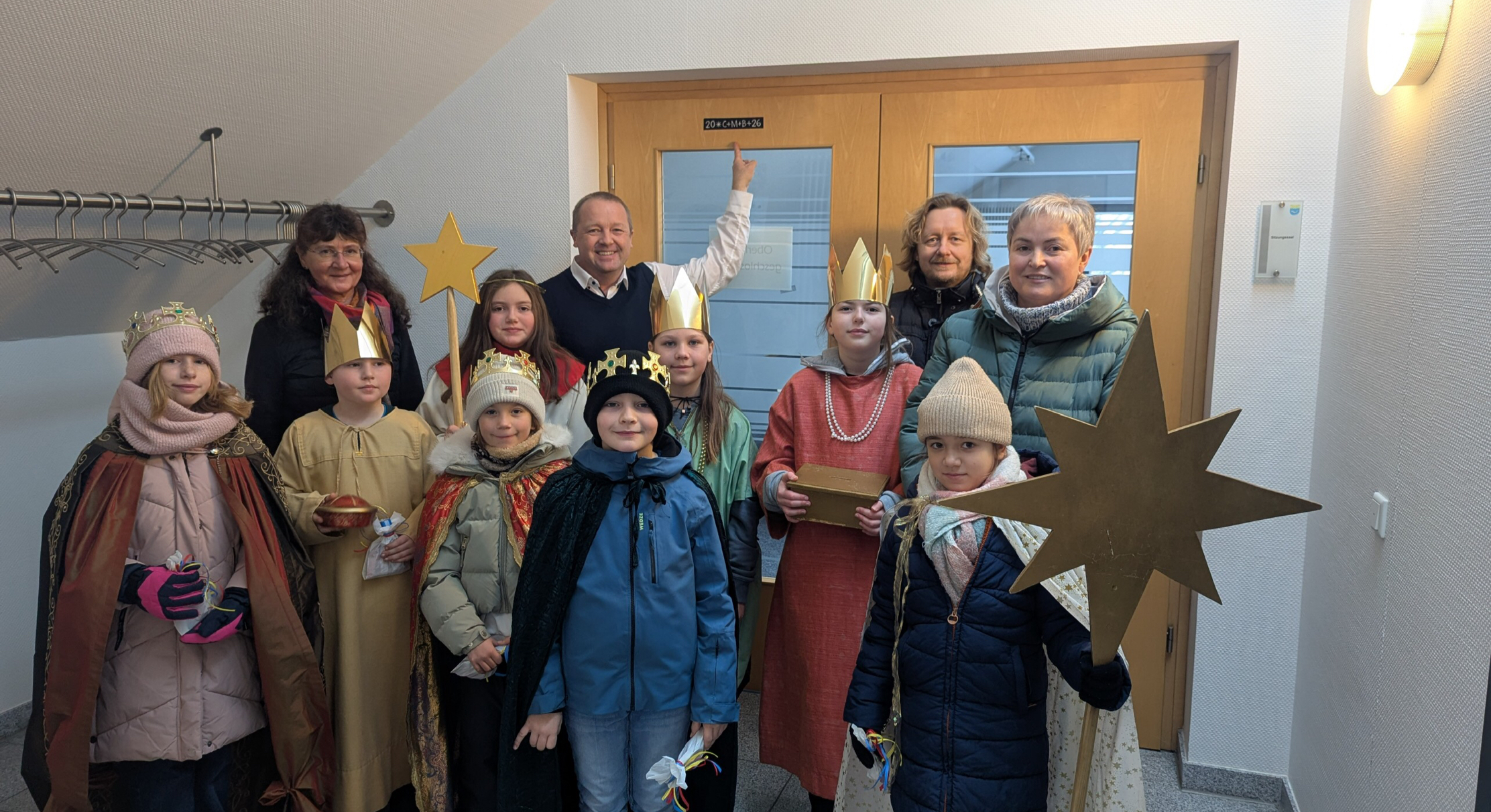 In den Kostümen der Heiligen Drei Könige Kaspar, Melchior und Balthasar brachten sie über der Eingangstür zum Sitzungssaal des Rathauses, als Zeichen für ein politisches Miteinander, den Segenswusch „20*C+M+B+26“ an. Die Kürzel stehen für die lateinische Segensbotschaft „Christus mansionem benedicat“, was übersetzt „Christus segne dieses Haus“ bedeutet. Die Sternsinger sangen außerdem ein Lied und trugen ein Gedicht vor.