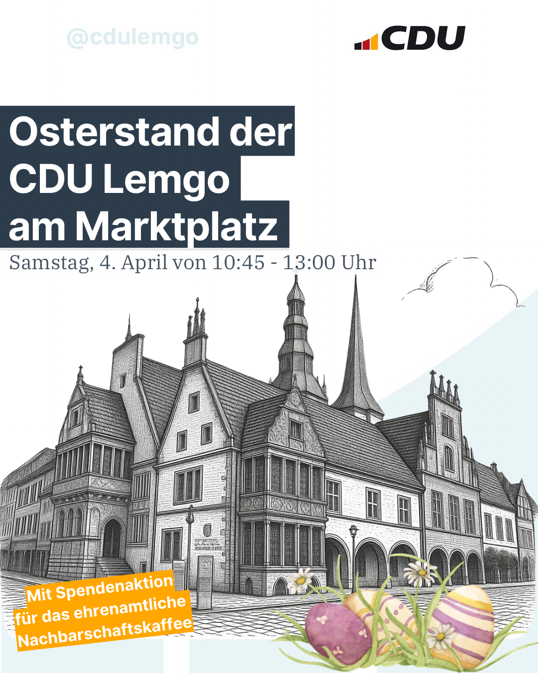 Ostern ist das Fest der Hoffnung und des Neuanfangs – Werte, die auch unser politisches Engagement in und für Lemgo tragen. In diesem Sinne verbindet die CDU Lemgo ihren Osterstand auch in diesem Jahr mit einer Spendenaktion für einen guten Zweck: Wie bereits in der Adventszeit sammeln wir für das ehrenamtliche Nachbarschaftskaffee im Schützenhaus. Das Nachbarschaftskaffee bringt Menschen zusammen, schafft Begegnung und stärkt den Zusammenhalt in unserer Stadtgesellschaft – ein Engagement, das ganz im Zeichen der christlichen Nächstenliebe steht und unsere volle Unterstützung verdient. Jede Spende, ob klein oder groß, hilft, dieses wertvolle Ehrenamt weiterzuführen.