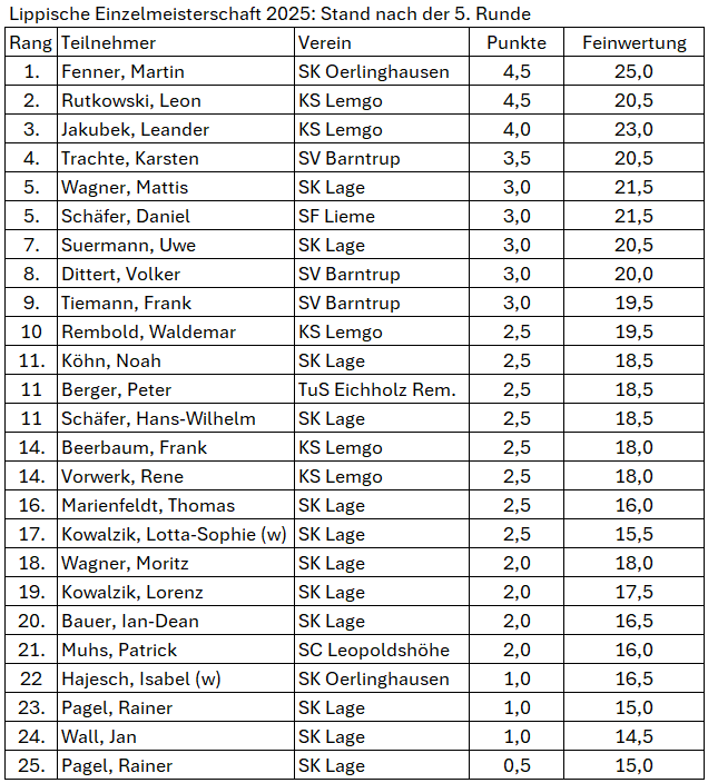 Da nur noch diese vier Spieler die lippische Schachkrone gewinnen können, werden die Partien zwischen dem Spitzenreiter und Titelverteidiger Martin Fenner gegen Karsten Trachte sowie Leon Rutkowski gegen Leander Jakubek sicherlich spannend werden.